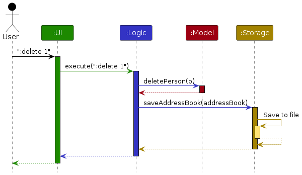 The Sequence Diagram below shows how the components interact with each other for the scenario where the user issues the command :delete 1.